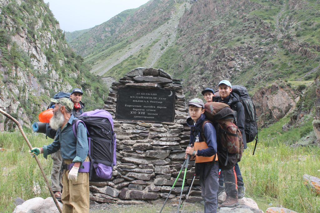 В 9:30 утра вышли на маршрут. Направились по грунтовой дороге вдоль реки Ак-Суу на юг в сторону перевала Джарташ. Дорога несколько раз пересекает реку, мы переходили через хорошие мосты. В 12:00 на левом берегу реки вышли к памятнику Асылбашу Кудайменде, как написано на памятнике, первому киргизскому послу в Китае.