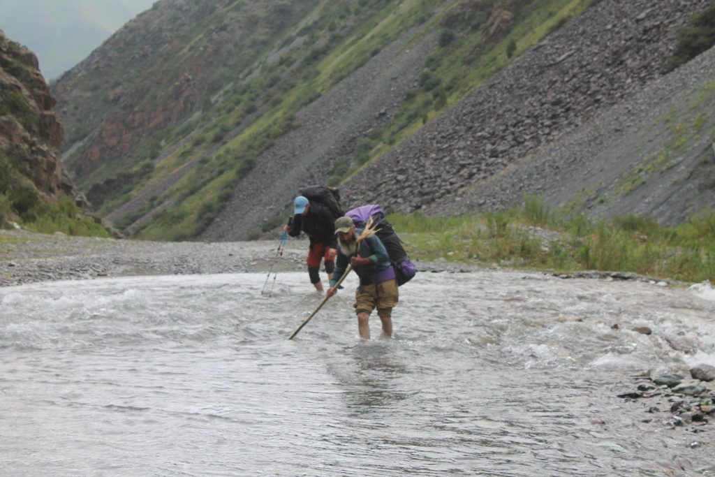 Крутая осыпь, спускающаяся со склонов гор, часто обрывается прямо в реку, тогда идти приходится вдоль границы воды и камней.
