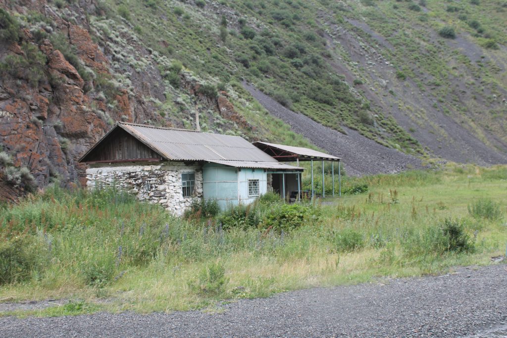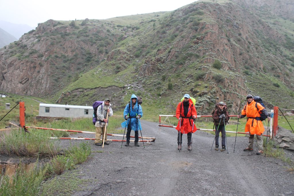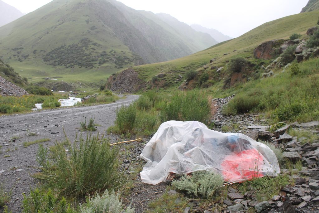 После обеда в 15:30 продолжили движение по маршруту. Двигаясь по дороге далее вдоль реки Ак-Суу в 17:20 достигли устья реки Бойрок. Здесь нас застал дождь, и мы полчаса просидели под тентом. Тент представляет собой большой кусок полиэтилена, такой используют дачники при установке теплиц. В случае дождя его можно быстро расправить и под ним спрятаться людям с рюкзаками.