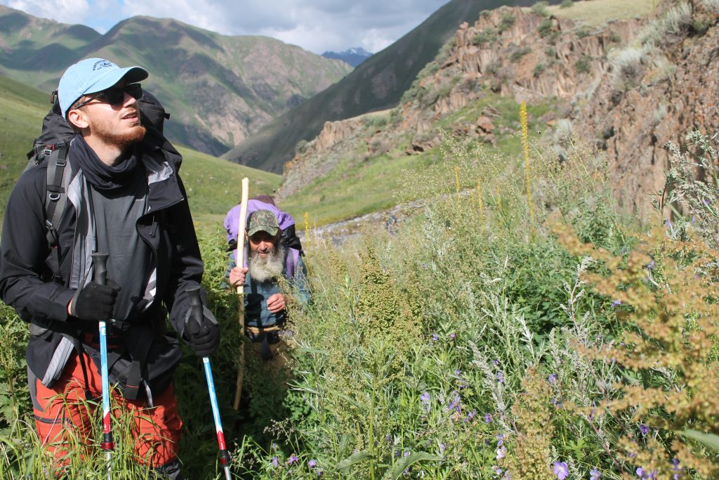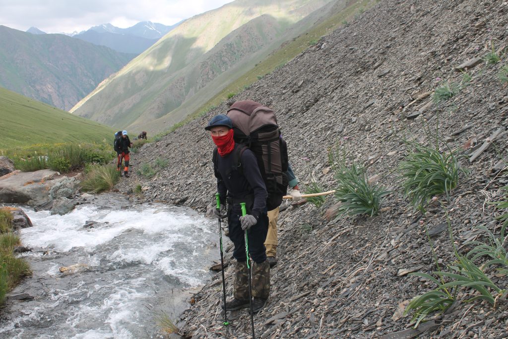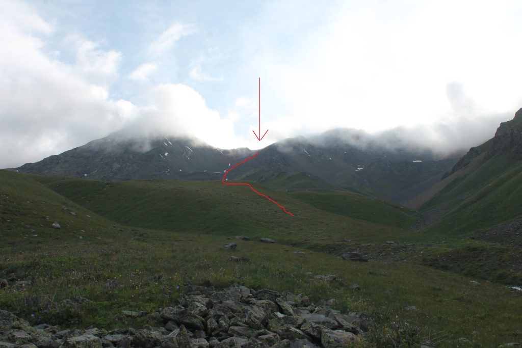 Когда дождь почти прекратился продолжили движение по левому берегу реки Сокулук около 2 километров до выхода долины, ведущей к перевалу Сокулук I. Напротив этого места стоит кош, судя по всему обитаемый, так как до нас доносился лай собак, но людей не было видно. После небольшого привала начали подъём по крутой долине к перевалу по слабоприметной тропе. Сначала тропа серпантином поднимается по правому берегу стекающего ручья в зоне альпийских лугов. Затем мы вошли с цирк перевала и здесь начали подъём по осыпному склону. На тропе встречаются следы лошадиных копыт.