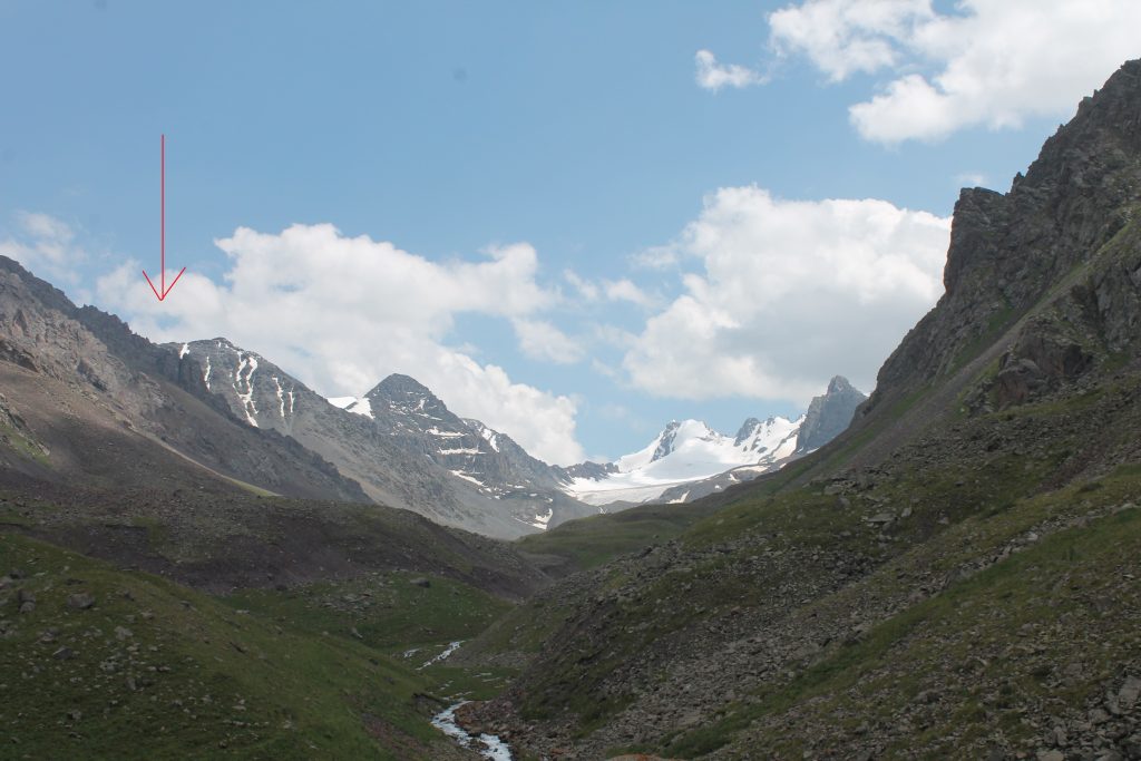 Поднявшись на гребень осыпного вала, мы увидели верховья долины реки Ак-Суу. С этого места уже просматривается долинка между горами, которая ведёт к перевалу Джарташ.