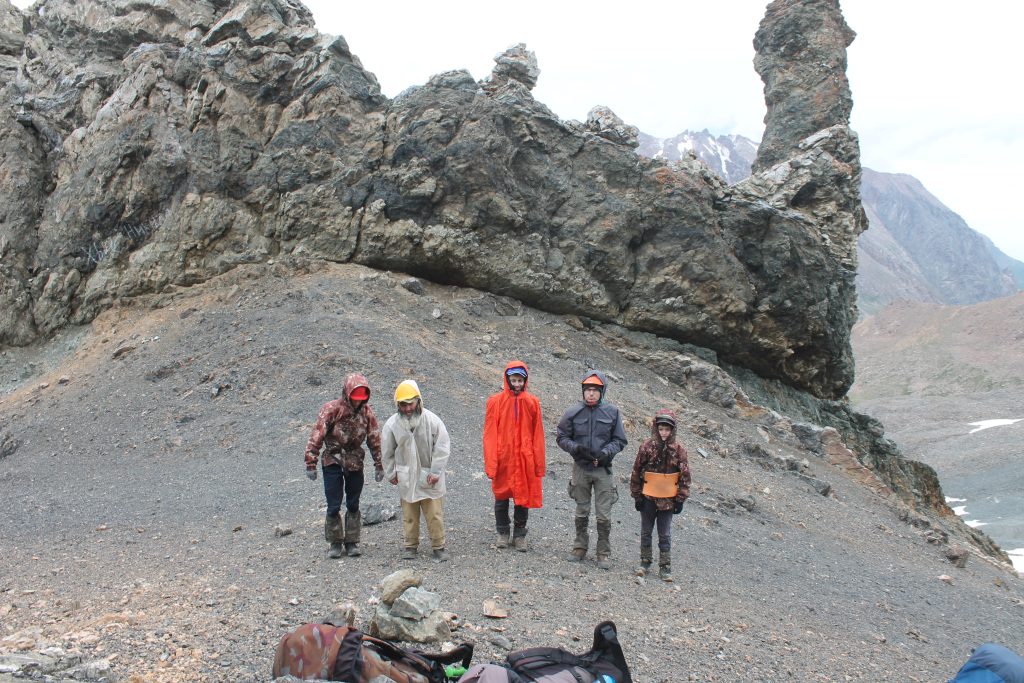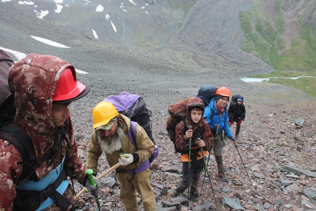 В 13:00 пообедали, не выходя из палаток. Во время обеда дождь перестал, и мы быстро стали складывать палатки. В 14:10 вышли на маршрут и направились вверх по направлению перевала Джарташ (1А, 3817). Подъём начинается по заросшей травой осыпи, а затем по голому осыпному склону. По осыпным склонам плотной группой прошли к перевальной седловине, которая находится слева от отдельной треугольной скалы, находящейся на гребне хребта. Перевал Джарташ находится в водоразделе Киргизского хребта, перейдя его, мы оказывались на южных склонах. Двигаться по осыпи, где из-под ног могут покатиться камни, следует плотной группой. Смысл это в том, чтобы летящий камень не смог разогнаться до скорости, при которой он может нанести увечие.