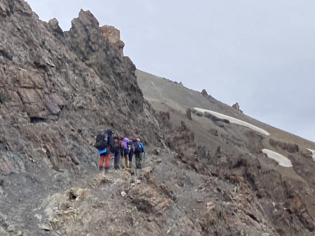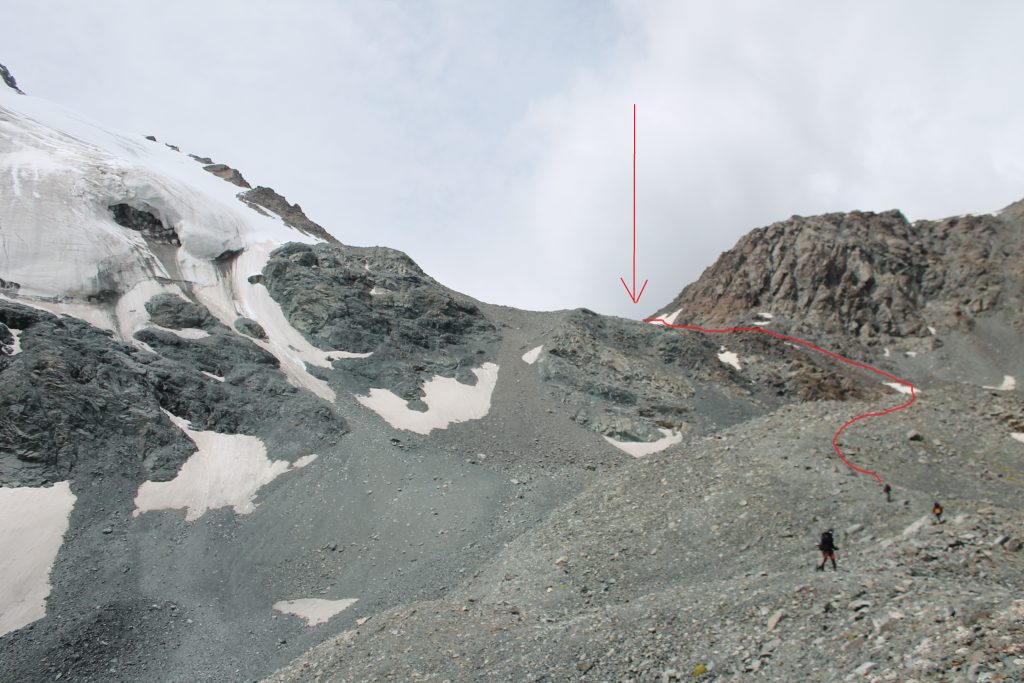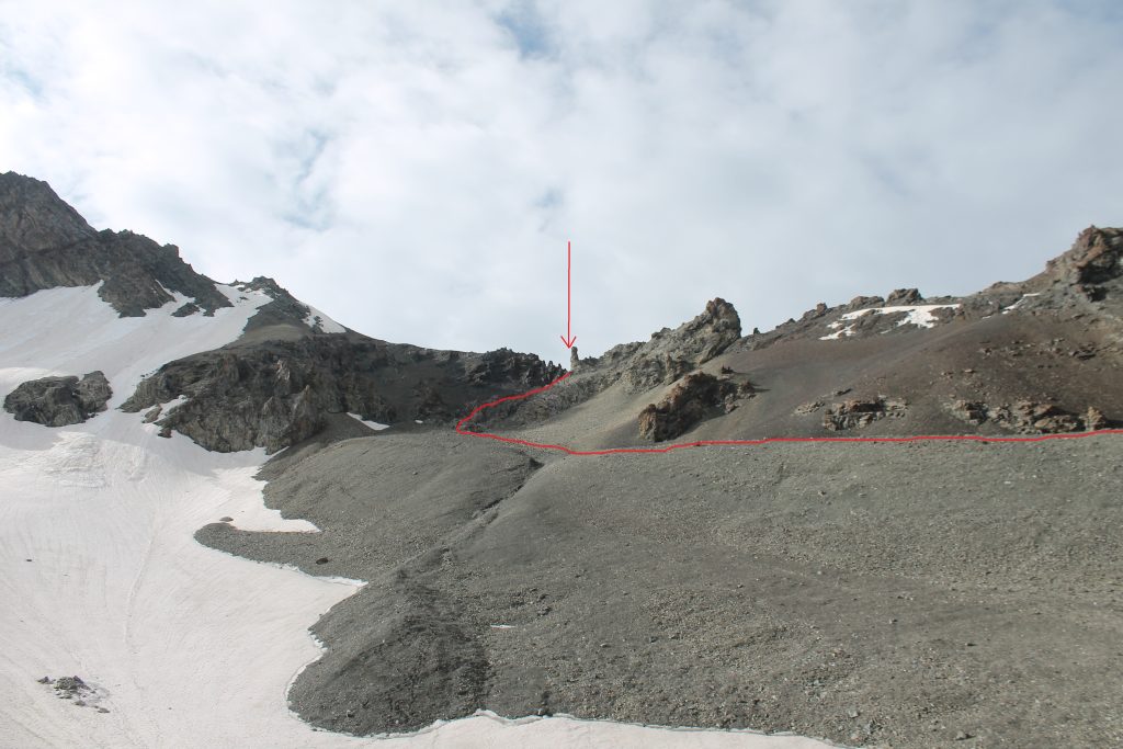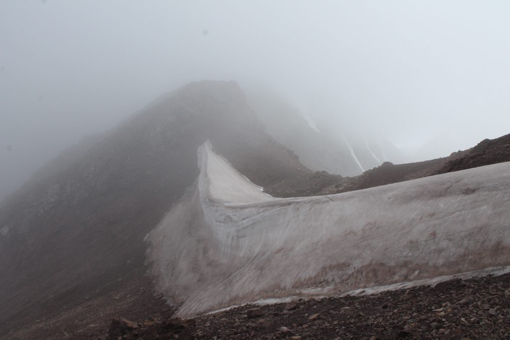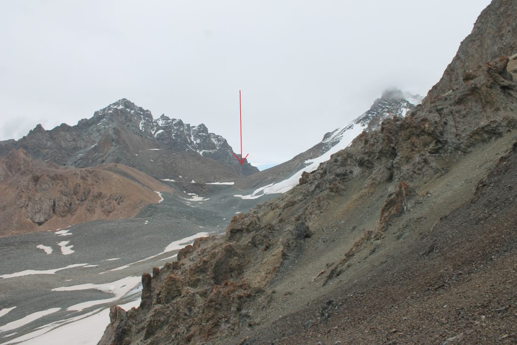 На пути спуска на восток висит снежный козырёк. Перед походом мы изучали отчет группы Московского государственного университета под руководством Бирючевой Екатерины Олеговны. Они тоже проходили перевал Джарташ в июле и описывали этот снежный козырёк. Московские туристы в 2019 году спускались с козырька по верёвке. Мы же нашли лёгкий и безопасный путь обхода козырька слева по ходу движения. Нужно немного подняться севернее по хребту, а затем спускаться по осыпи.