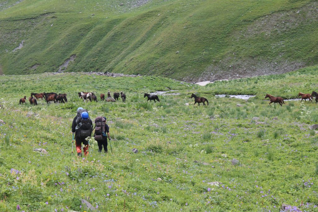 Наш путь проходит по травяным склонам вниз вдоль реки Джарташ Вост. в направлении её слияния с рекой Сокулук. Вскоре встречаем табун лошадей, которые пасутся сами по себе без пастуха. Лошади нас боятся и бегут впереди.