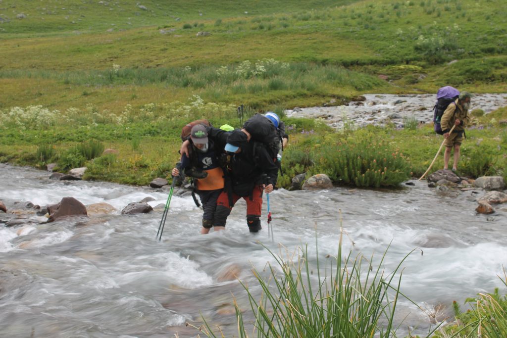А после этого в 9:45 вышли к слиянию рек Джарташ Вост. и Сокулук. Здесь мы устроили переправу. Глубина воды до 30 см, ширина переправы 15 метров, течение довольно сильное. Переходили методом стенки по двое так, чтобы наиболее сильные ребята поддерживали детей.