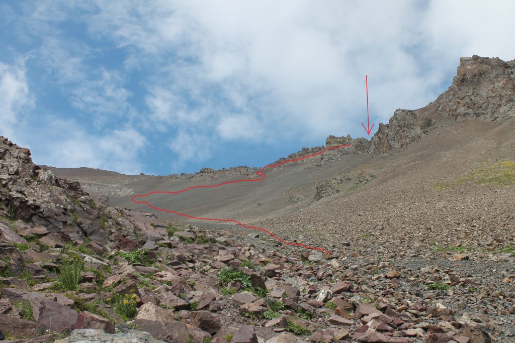 Перевал Сокулук I довольно необычный. С юго-запада седловина различима только при изучении фотографии. Тропа в осыпном цирке выводит нас на запад от перевала, а потом резко поворачивает на северо-восток и выходит почти на гребень хребта метров 200 западнее (левее) седловины. И последний участок нужно пройти по полочке между скал.