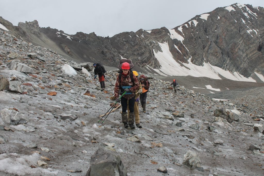 Первый участок спуска идёт через скалы. Используем несложное скалолазание с самостраховкой. Затем путь выводит нас на осыпной склон. В 17:20 выходим на ровный участок возле ледника Ашу-Тор. В планах этого дня было прохождение соседнего перевала Кичи-Тор, но по факту уже было поздно и рискованно начинать восхождение на перевал, поэтому мы решили стать на ночёвку. Воду здесь можно брать из ручейков, стекающих по телу ледника. Вокруг разбросано много обглоданных костей горных козлов, есть черепа, лопаточные кости, рёбра. Видимо, это следы жизнедеятельности снежных барсов.