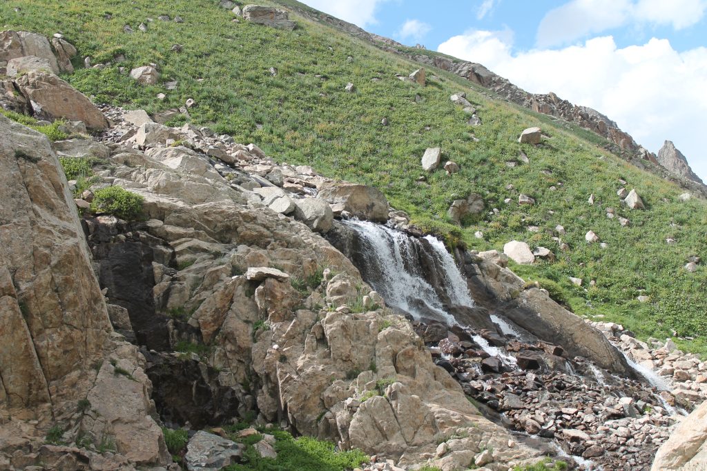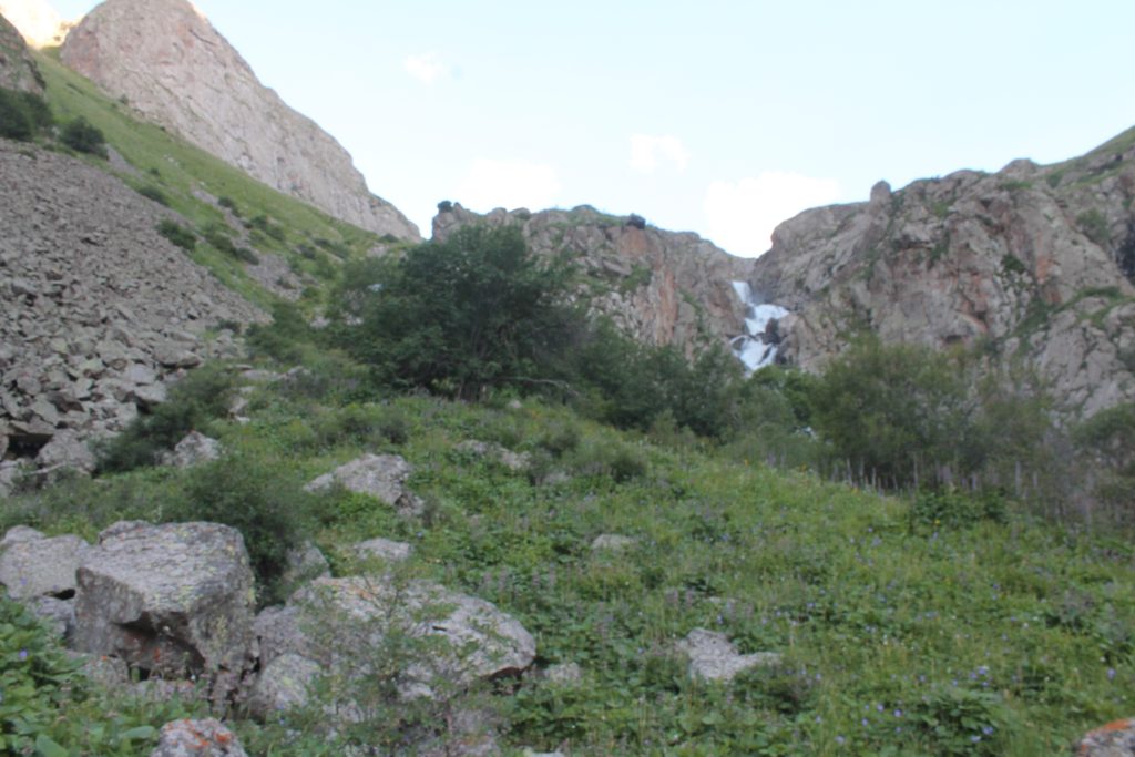 Выше долина реки представляет собой несколько травяных равнин, сменяющихся осыпными ступенями. Около 16:30 нам предстояло подняться по крупным камням вдоль небольшого каскадного водопада. Здесь мы впервые в этом походе встречаем эдельвейсы. Эдельвейс — небольшой, невзрачный цветок, окутанный легендами. Растение невысокое, с мелкими корзинками сереньких цветков, окружённых остроконечными листиками с беловатым пушистым налётом. Нельзя сказать, что эдельвейс растёт на самых высоких горах, мы встречали цветки, которые росли повыше, чем он. Но красивое название и некая загадочность привлекают внимание людей.