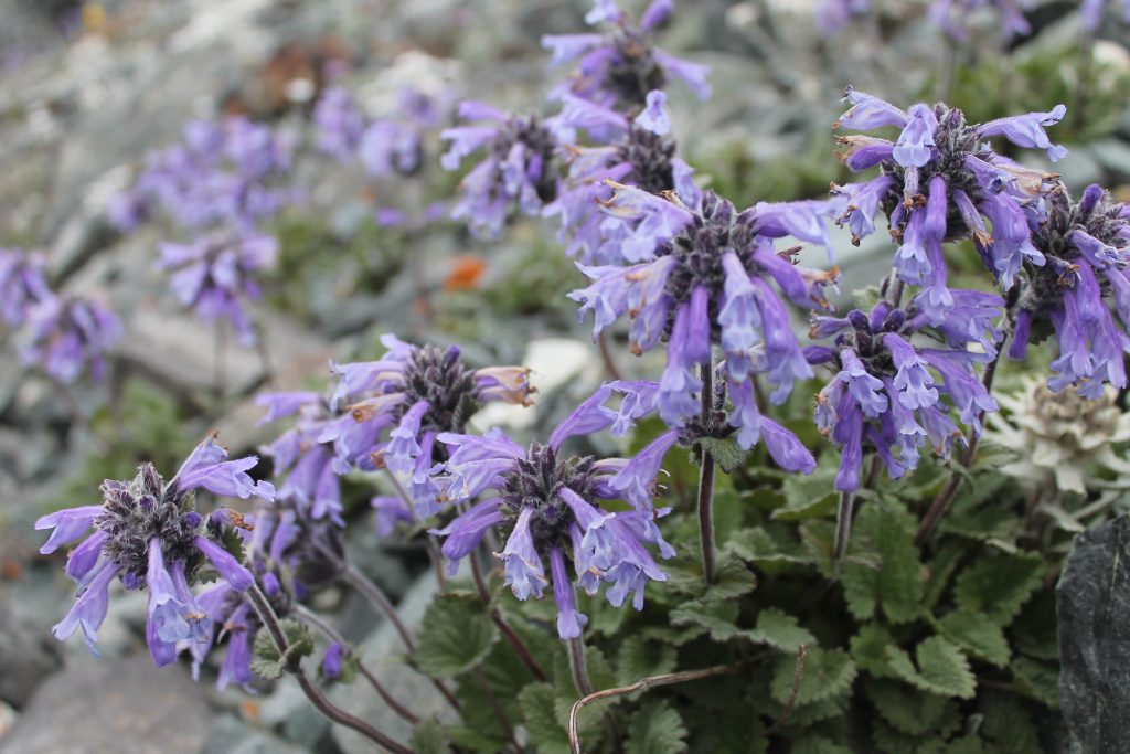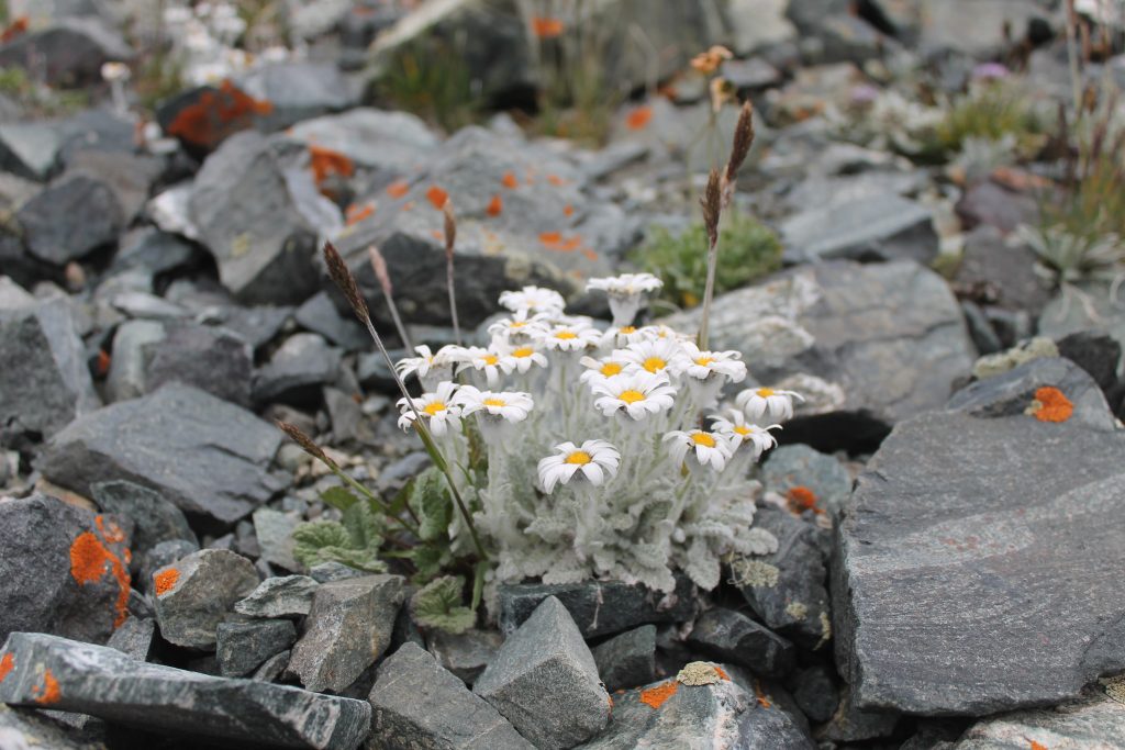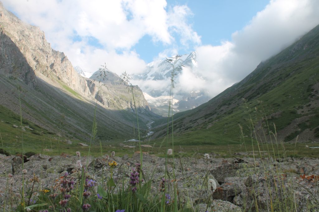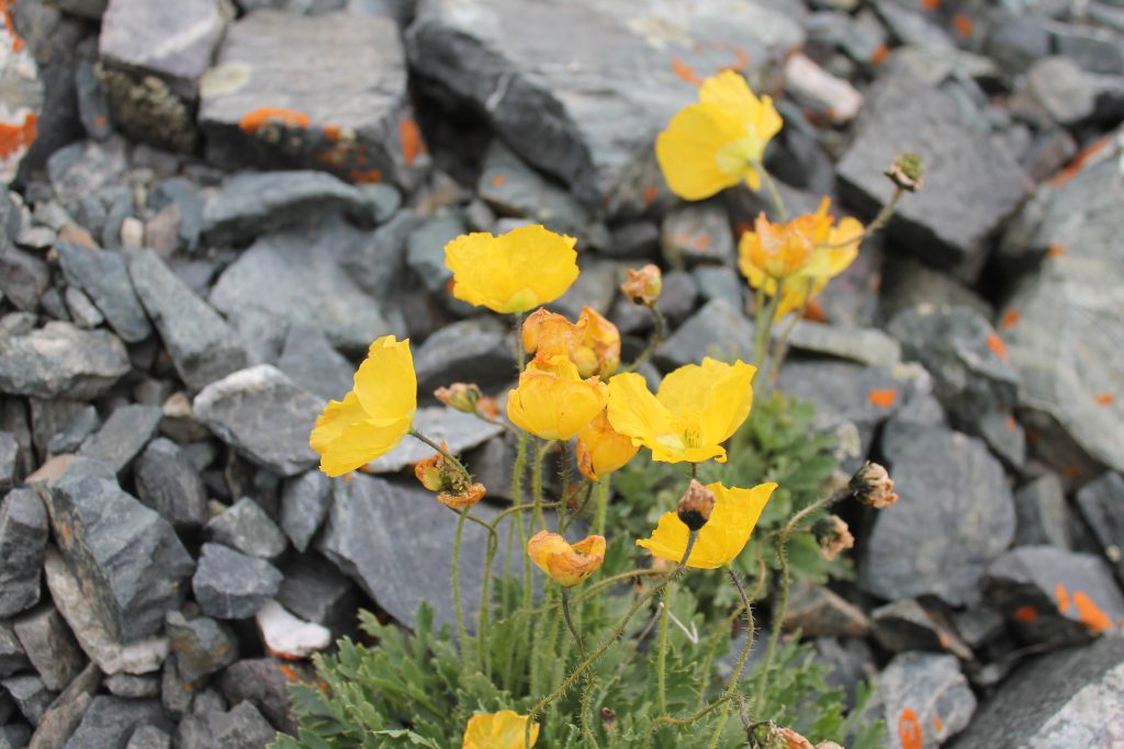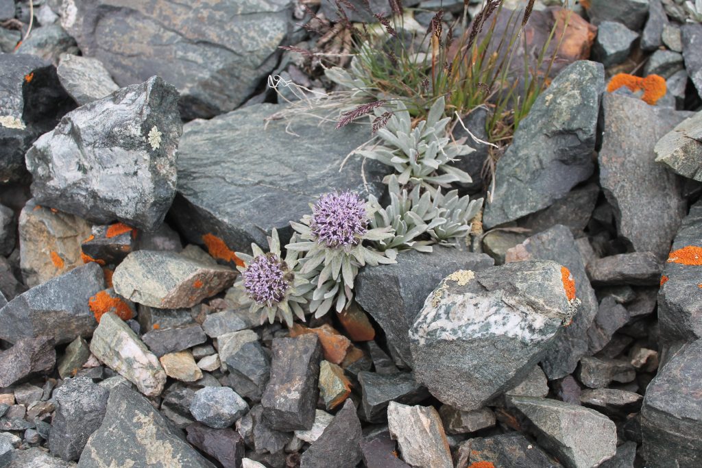 На морене среди камней встречаем высокогорную растительность: похожие на ромашки цветы рихтерии эдедьвейсовидной, шаровидные голубовато-розовые соцветия соссюреи гнафалиевидной, синие цветы змееголовника и цветки желтого мака.