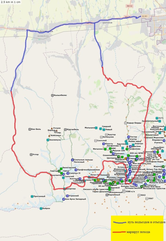 Село Кепер-Арык — д.р. Ак-Суу — переправа через р. Иша (н/к) — Жарташский нарзан — пер. Джарташ (1А, 3817) — переправа через р. Сокулук (н/к) — пер. Сокулук 1 (1А, 3728) — пер. Кичи-Тор (1А, 3870) — д.р. Кичитор — д.р. Чонтор — связка (пер. Проходной (1А, 3735) + пер. Широкий (1А, 3880) + пер. Молодая Гвардия (1Б, 3833)) — оз. Советских офицеров — пер. Ала-Арча (1А, 3907) — альплагерь Ала-Арча — СТ Наука — траверс северных склонов — село Джангарач.