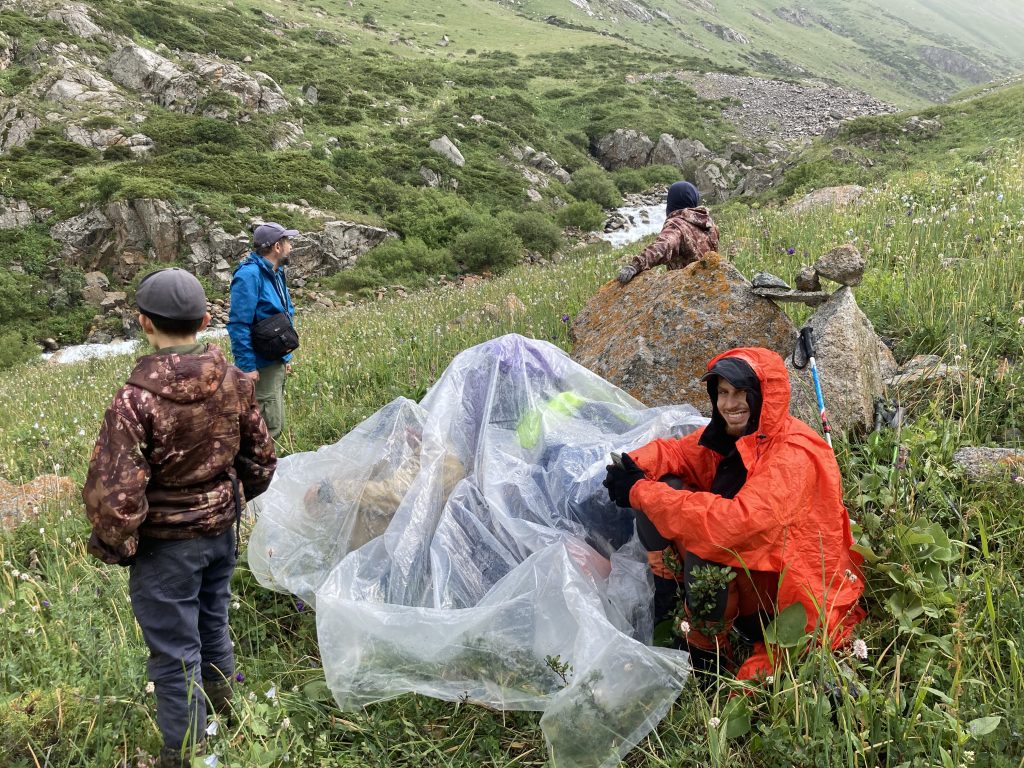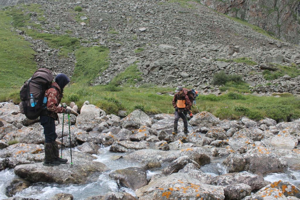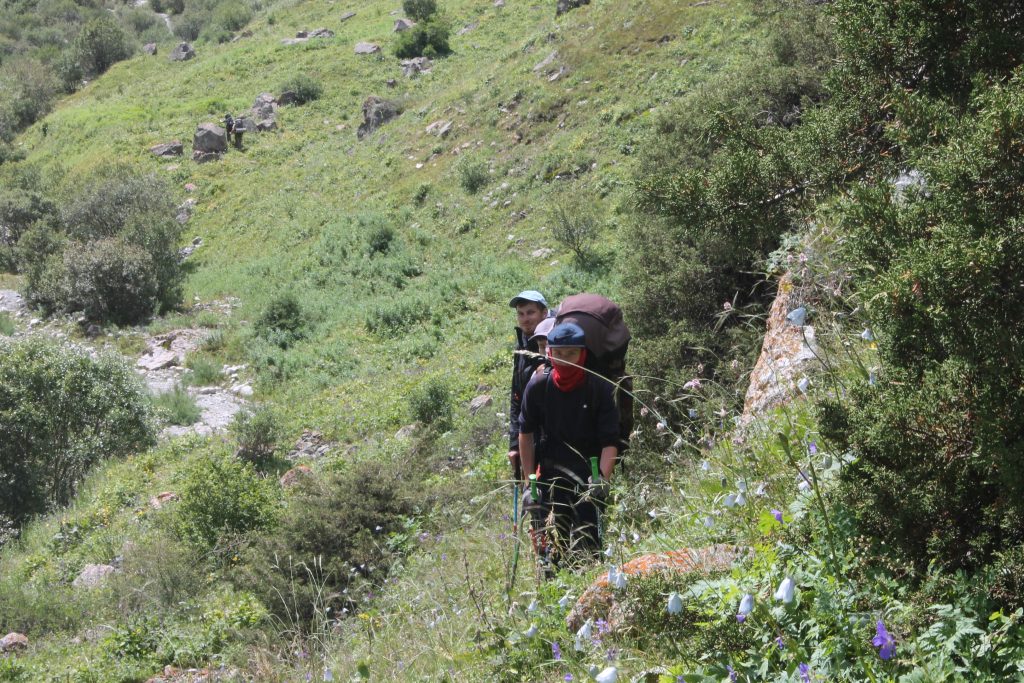 Подъем в 6:30. Приготовили завтрак, поели, собрали палатки. В 8:50 вышли на маршрут и начали движение вверх по слаборазличимой, иногда теряющейся тропе вверх по левому берегу реки Чонтор. Тропа проходит через кусты малины, затем через высокую траву. Утром трава покрыта росой, так что наши ноги быстро промокли.