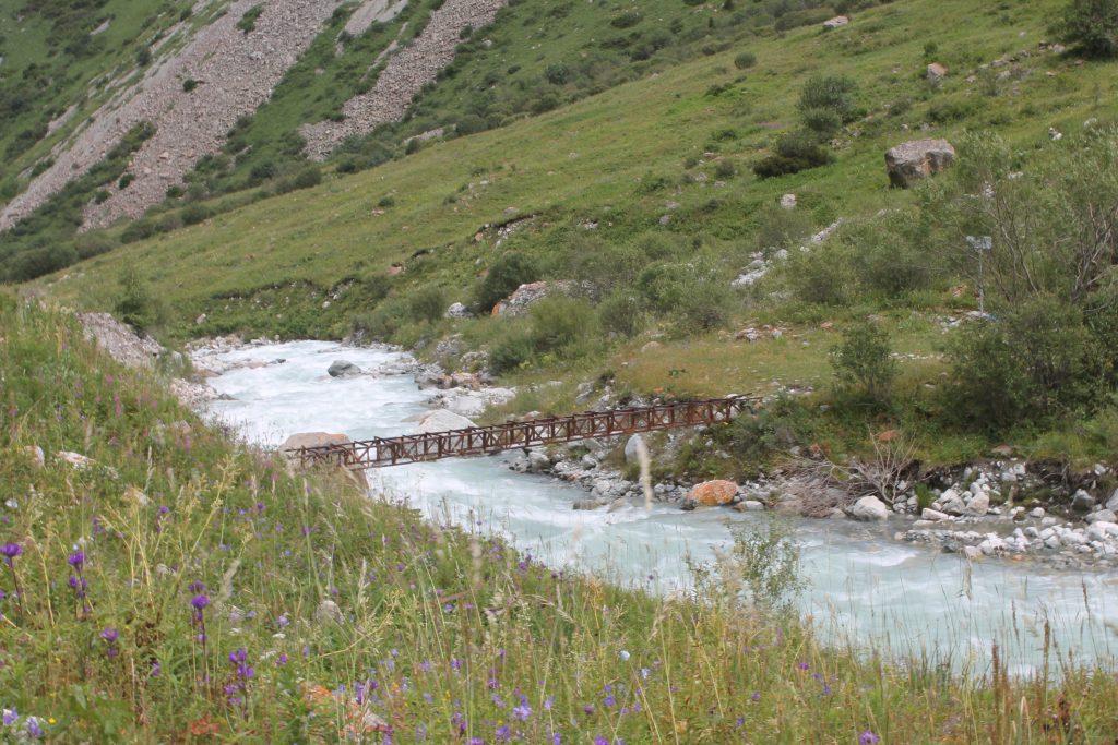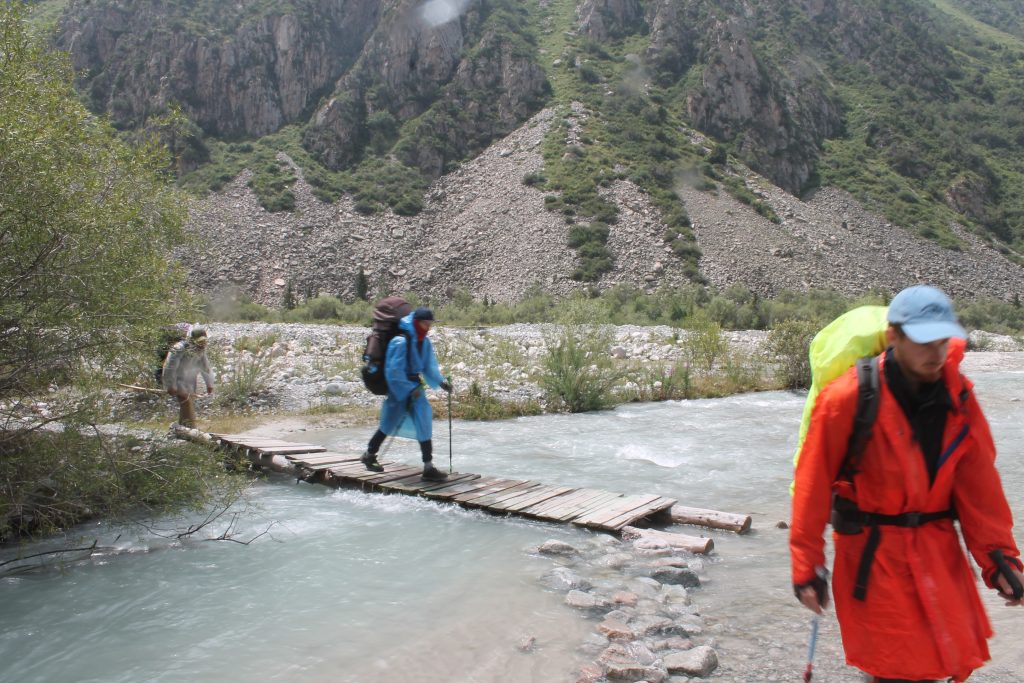 Вскоре после перехода через этот мост нас догнал кратковременный дождь. Мы надели дождевики и продолжили движение. По деревянному мостику перешли через реку Ас-Сай и вышли на асфальтированную дорогу в пределах комплекса альплагеря Ала-Арча. В 14:40 подошли к гостиницам, и на этом закончили маршрут на этот день.