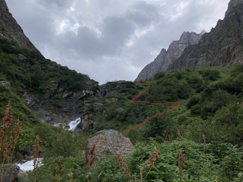 Правый приток реки Чонтор — неширокая речка, и практически в каждом месте её можно перейти по камням, не намочив ноги. Вскоре после того, как мы вышли в долину правого притока, в 15:20 перед нами предстал водопад, который следует обходить по левому берегу, по скальному уступу. Для этого мы перешли на левый берег, а потом поднялись на скальную ступеньку. После этого перед нами открылась широкая долина с голубым озером.