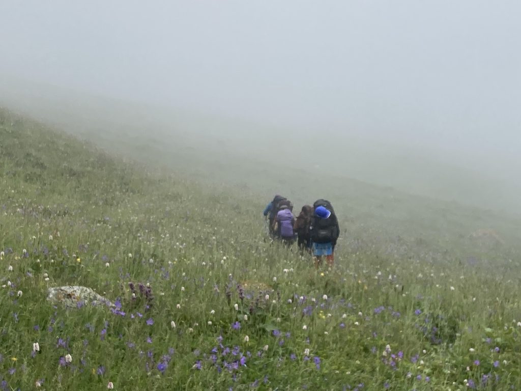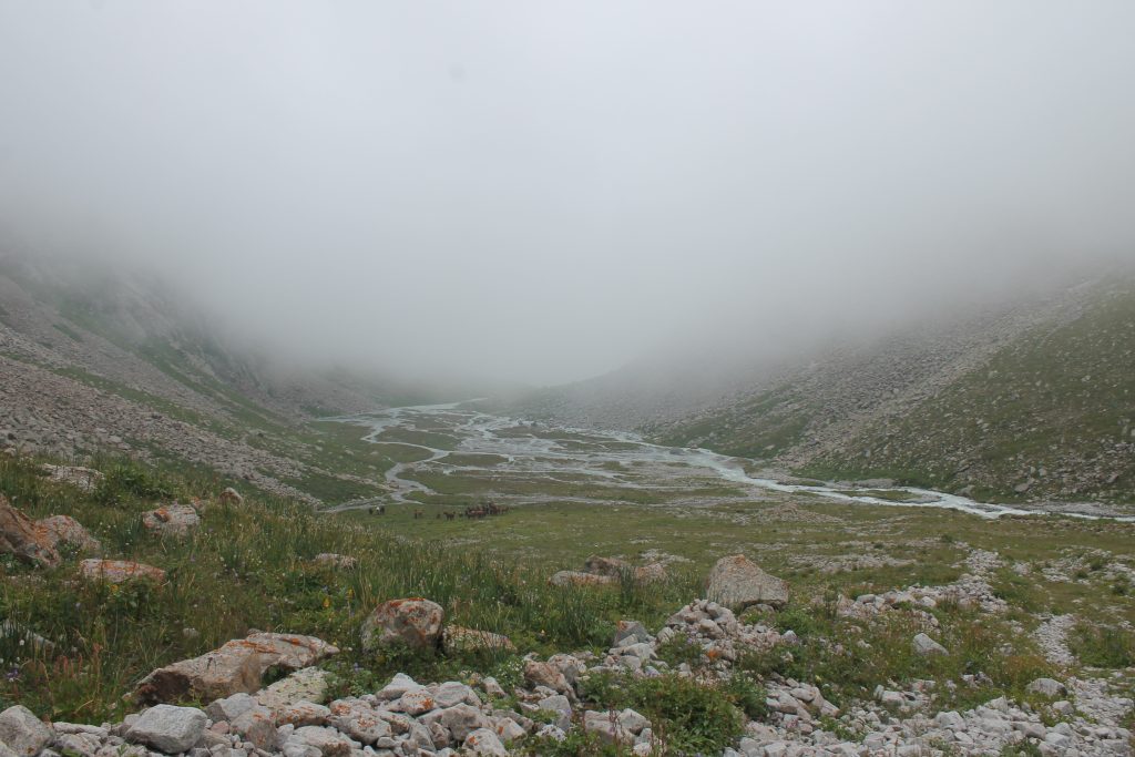 Сразу после переправы начинаем подниматься по старым травянистым моренам полого вверх в направлении правого притока реки Чонтор, берущего начало у перевалов Проходной, Озёрный, Сыпучий и других. По пути на этих моренах нас настиг туман, а затем дождь. В этом походе редко какой день у нас обошёлся без дождя.