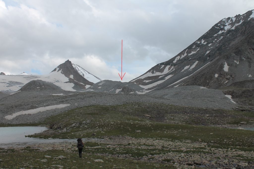 Сначала начали подниматься по осыпным моренам в направлении перевала Проходной. Иногда приходилось идти по снежникам. Надо было пройти несколько гряд каменных морен и подняться по некрутому снежному кулуару.