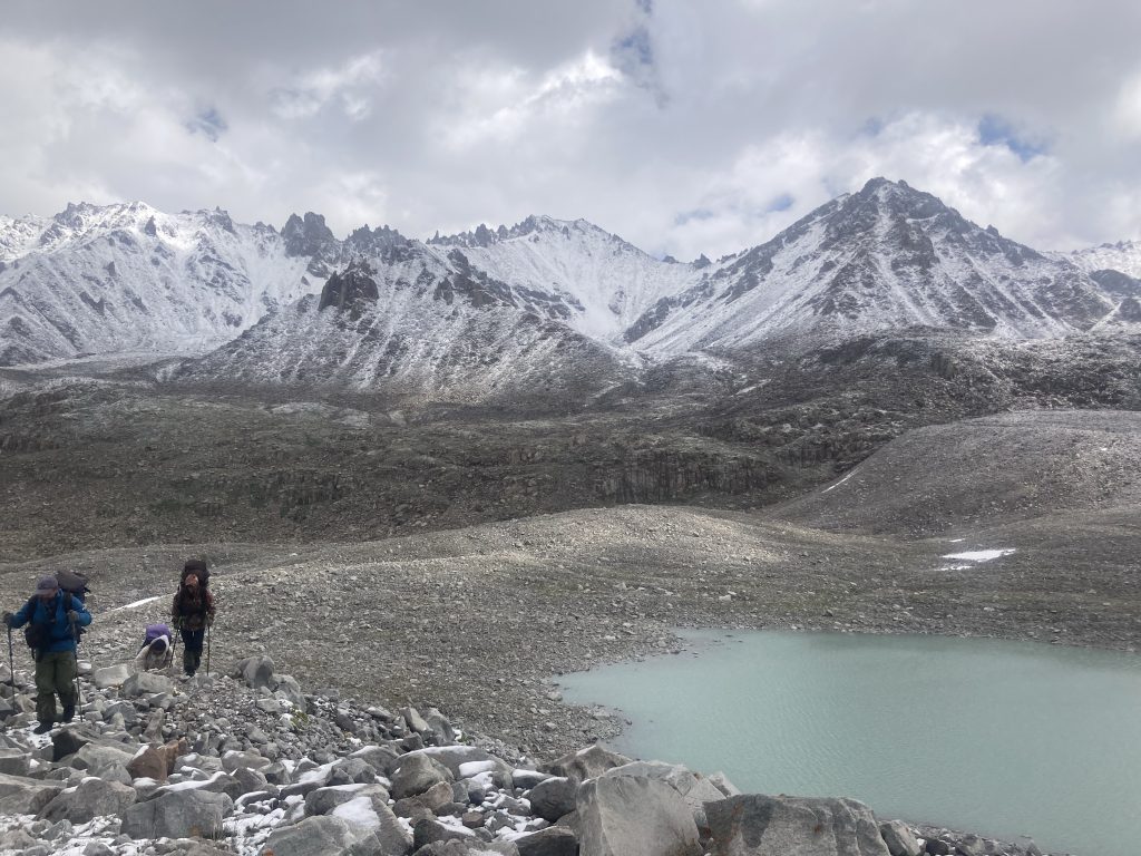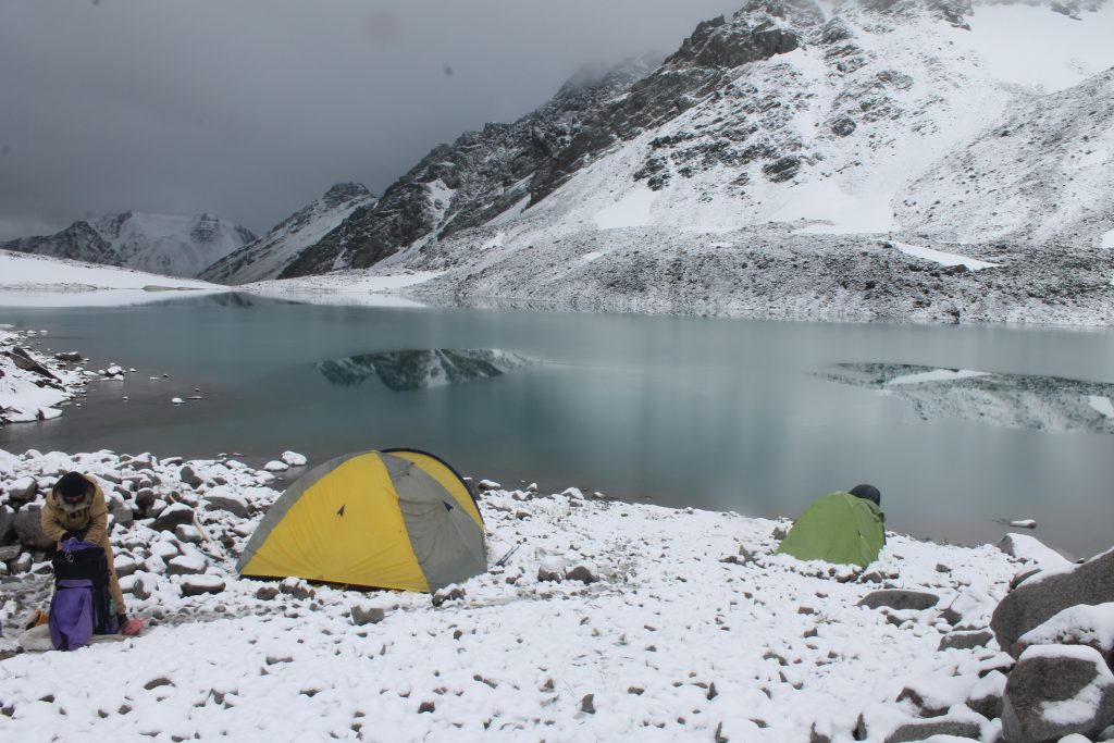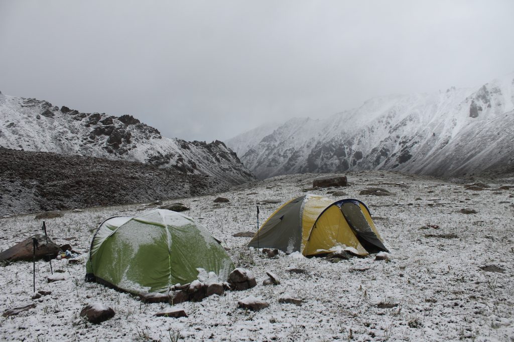 Ночью была сильная гроза и шёл снег. Наши палатки стали занесены снегом. Подъём в 6:30. Небо пасмурное, и все горы побелели от выпавшего снега.