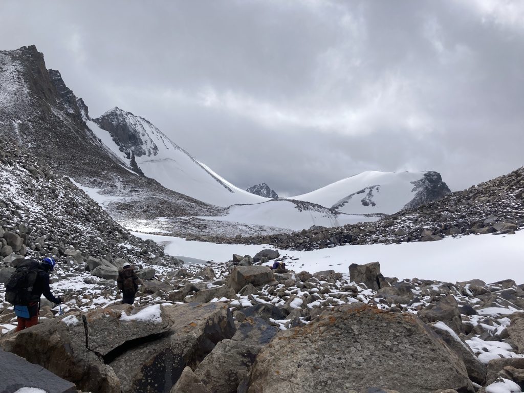 Уже с тела языка была видна конечная точка нашего дневного плана — озеро Советских Офицеров, которое выделялось своей бирюзовой водой среди камней и снегов. После прохождения языка ледника спустились по каменистым моренам и в 17:45 вышли на берег озера, где разбили лагерь. Озеро в это вечернее время под лучами заходящего солнца было особенно красивым.