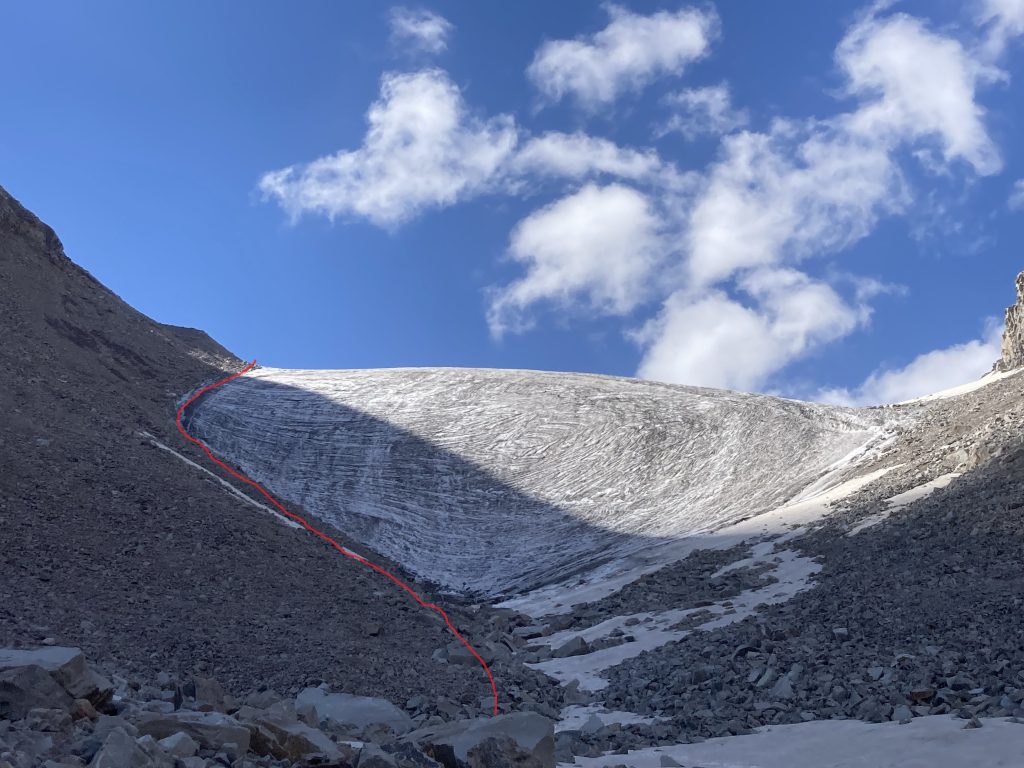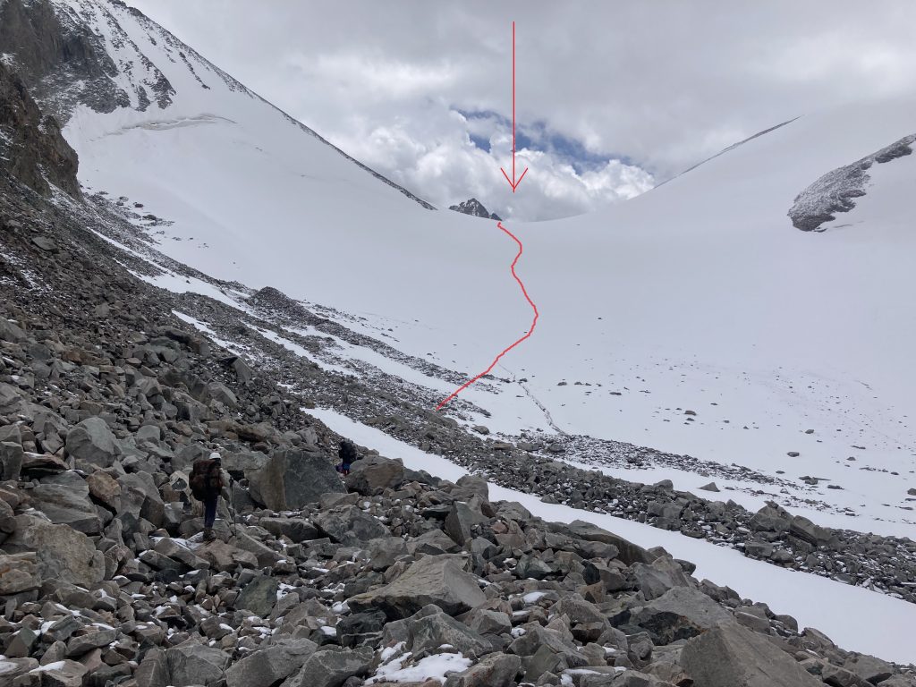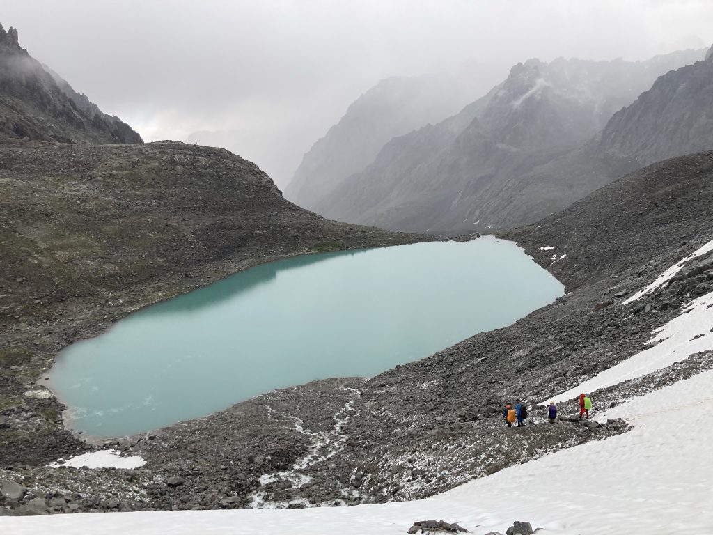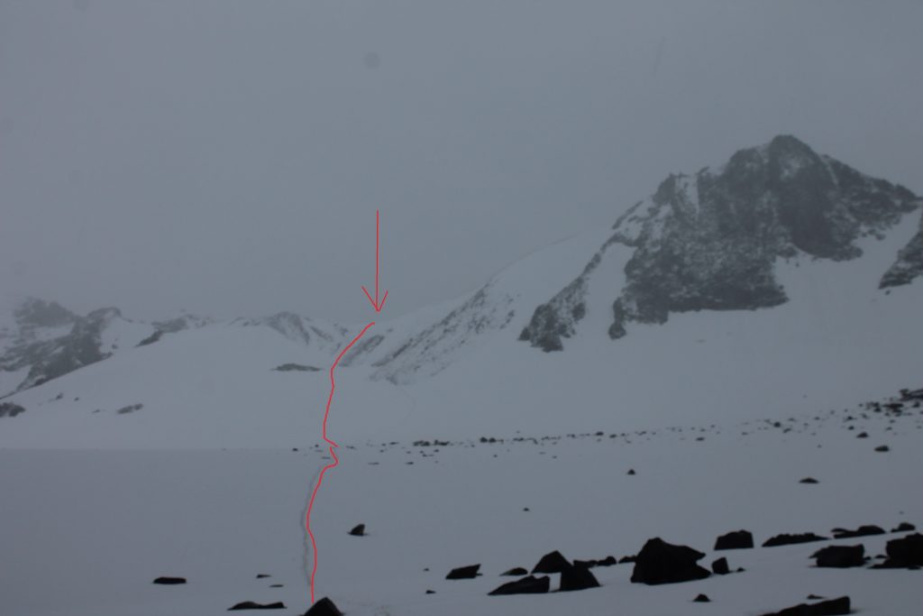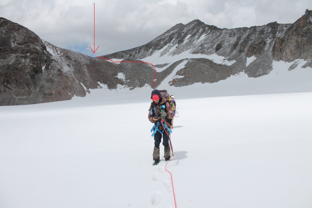 Спуск с перевала сначала по небольшому скальному участку, а затем с забором налево вдоль снежной полочки, стараясь держаться подальше от широкой трещины, находящейся справа от нашего маршрута. После этого мы вышли на пологое тело ледника. В отчётах предыдущих групп мы уже читали, что наибольшую сложность представляет спуск с крутого языка ледника. Напрямую спуститься сложно, можно двигаться или по правому или по левому краю языка. Мы выбрали правый край. Спускаться следует с особой осторожностью, так как под слоем камней находится лёд. Спускались с самостраховкой с помощью ледоруба, альпенштока или треккинговых палок.