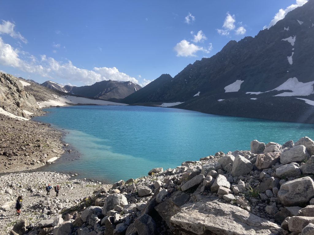 Тёплый вечер, несмотря на близость снежников, спускающихся с крутых склонов. Солнечные лучи пронизывают толщу кристально чистой воды, отчего цвет озера становится бирюзовым. Редкие шапки цветов, растущих на берегу в этом суровом крае. Горные хребты иногда скалами, иногда сыпухой обступают озеро со всех сторон. По насыщенно-голубому, почти синему небу плывут редкие облака. Ничего, что ночью пойдёт снег, и наши палатки превратятся в сугробы. Пока всё разноцветное и красочное. Уже только для того, чтобы это увидеть, можно ходить в походы. Благодать!