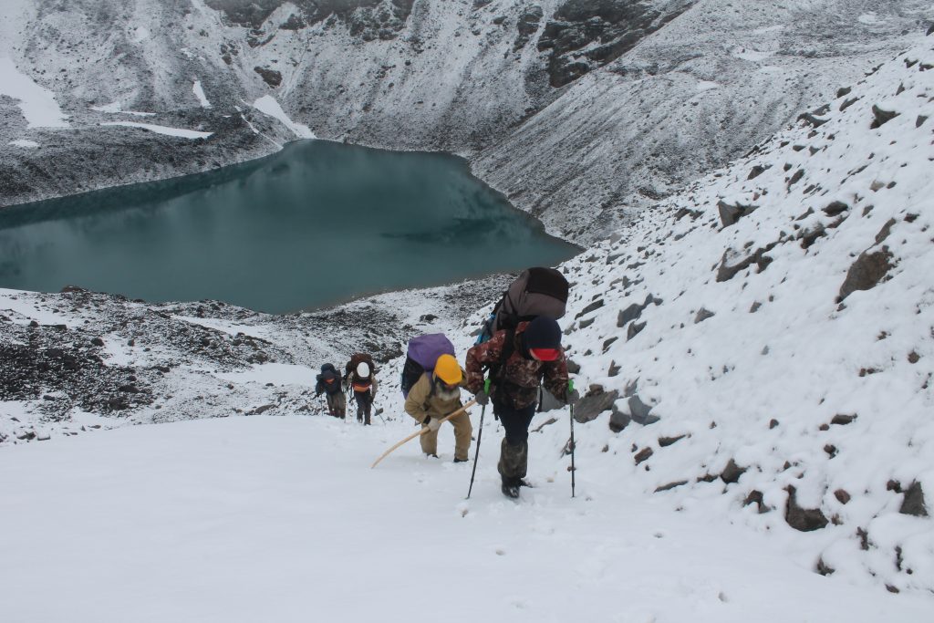 — нужно готовиться, что на такой высоте может наступить похолодание и выпасть снег. Взятые с собой тёплые вещи помогли нам преодолеть это испытание.