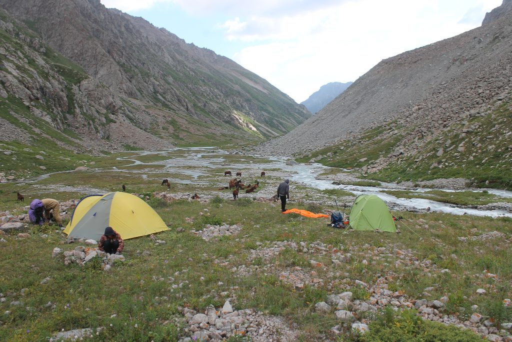 Вышли в широкую долину реки и в 18:40 стали на ночёвку на удобном ровном месте. Рядом с нами пасся табун лошадей. Лошади сначала испугались нас, а затем освоились и подходили близко к палаткам.