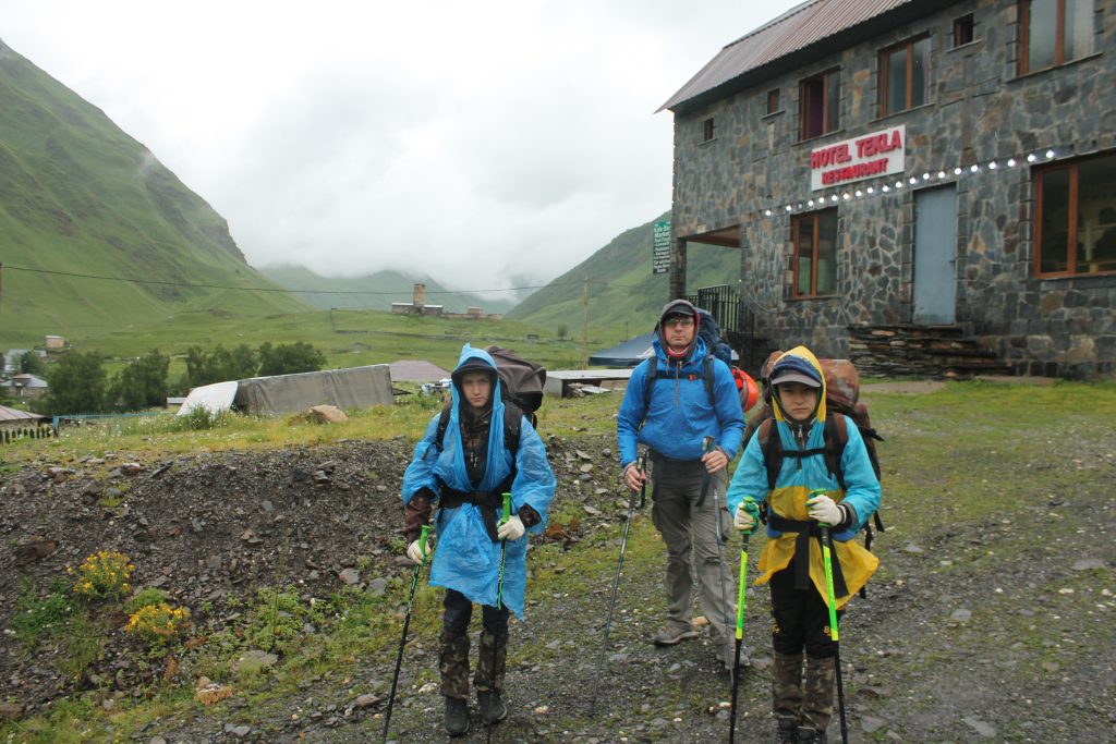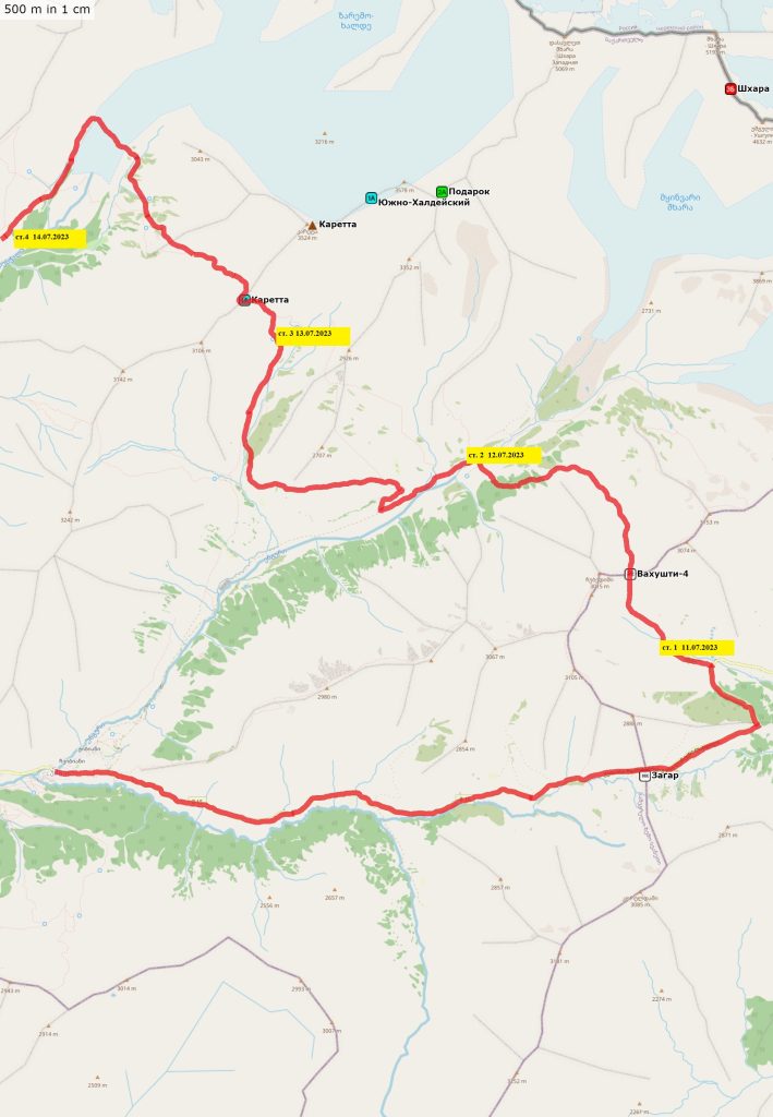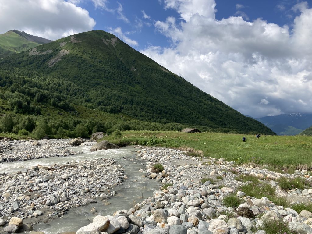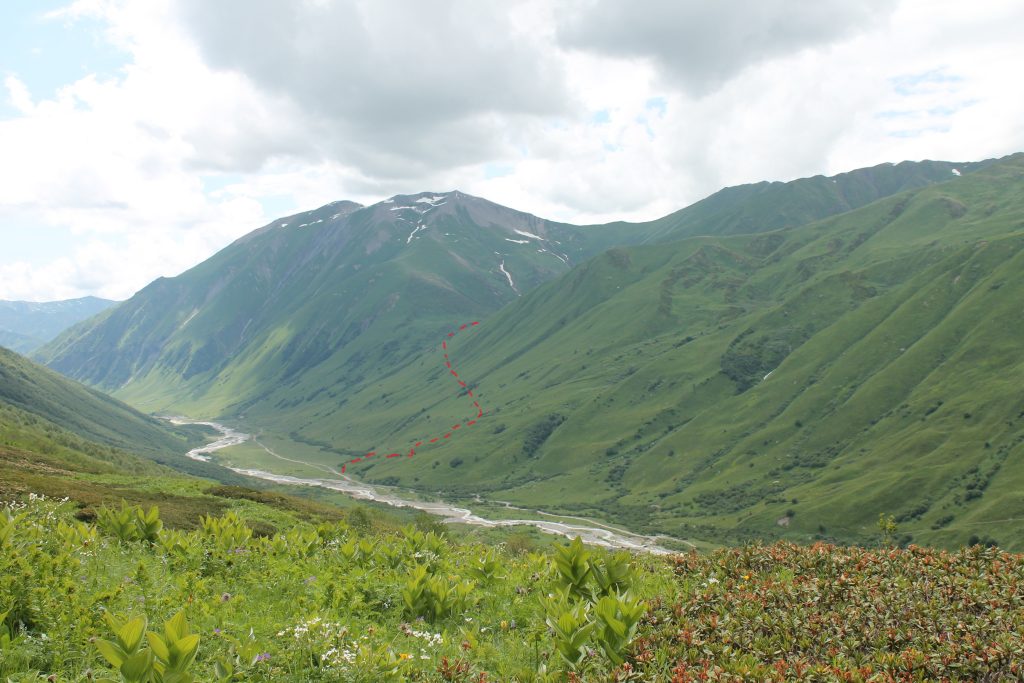 В 12:10 дошли до перегиба и вошли в долину реки Накарвалисгеле. В этом месте далеко внизу видны окраины деревни Ушгули, впервые за время нашего похода появилась мобильная связь и интернет, мы смогли связаться с родственниками. Здесь в 13:10 переправились на правый берег реки Накарвалисгеле, так как наш следующий перевал Каретта находится на правом склоне реки. Для переправы натянули верёвку.