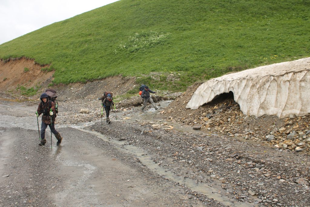 В 13:40 вышли в место, где дорогу пересекает снежник. Это был первый снег на нашем пути. Снежник указывает на приближение перевала. В течение похода мы ещё увидели много снега, но этот первый встреченный снежник в июле месяце вызвал у нас бурные эмоции.