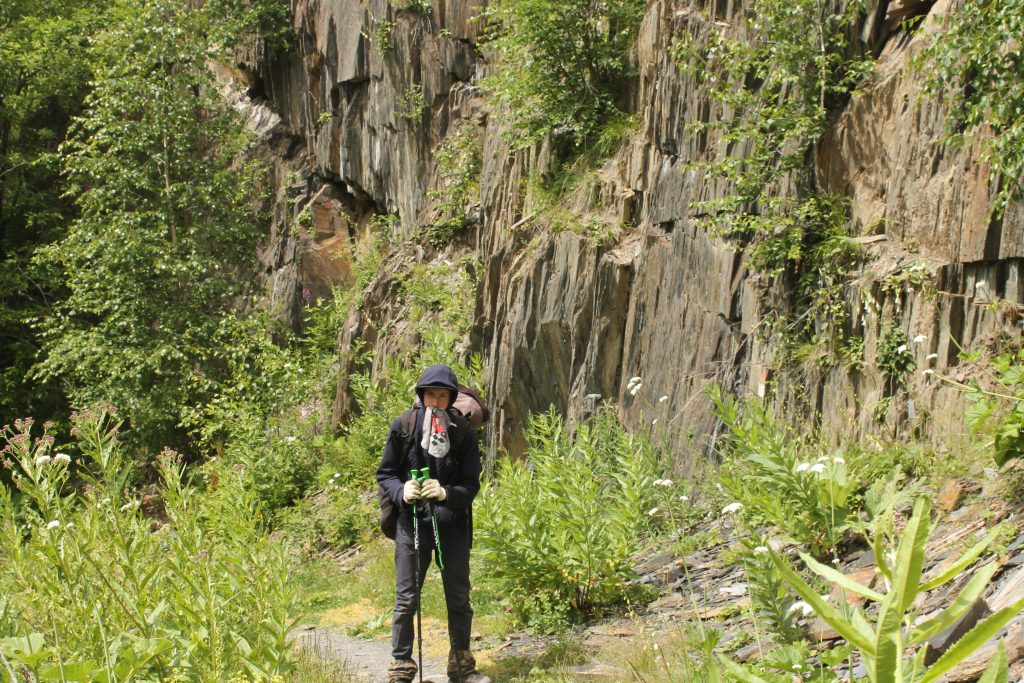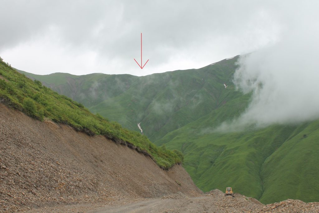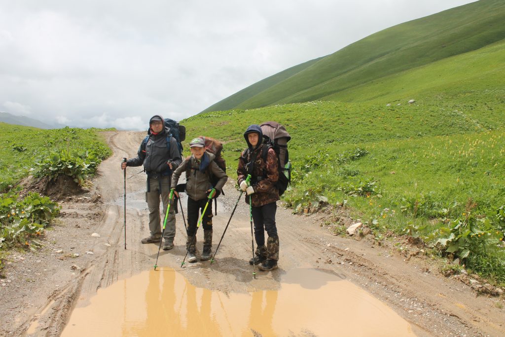 Спустя 2 километра пути приступили к подъёму по правому склону долины по малозаметной, заросшей травой тропе. Выходим на старую, заброшенную дорогу, которая траверсом полого поднимается к месту перегиба и выхода реки Накарвалисгеле. Дорога заросла высокой травой и кустарником.