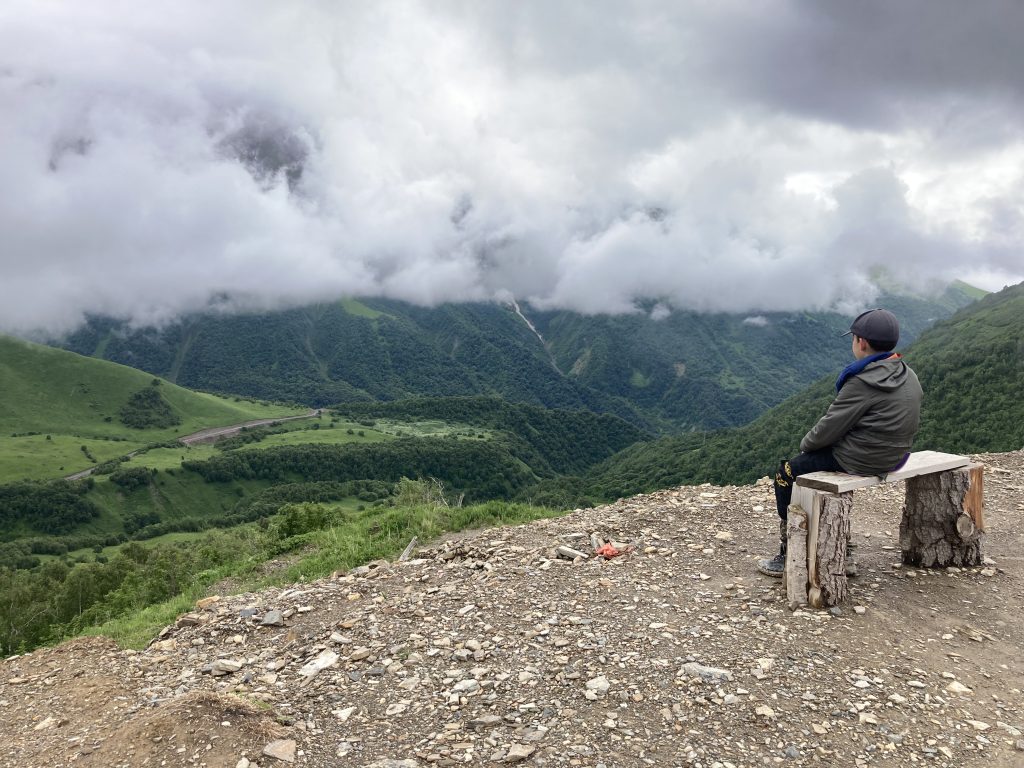 После перевала, двигаясь дальше по дороге, выходим к резкому повороту, с которого открывается красивый вид на Главный Кавказский хребет и вершины Айлама (4547) и Цурунгал (4250). На этом месте стоит скамеечка, с которой можно наблюдать окрестности. Остановились передохнуть, Ахмад уселся на скамейку и стал созерцать пейзаж.
