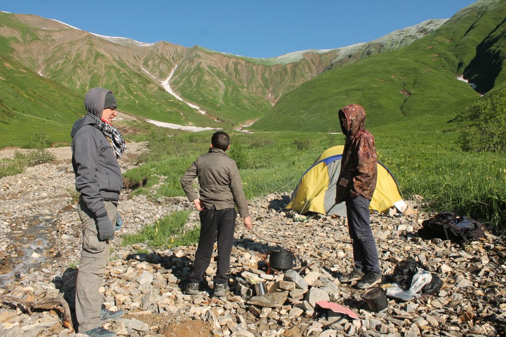 Проснулись в 6:00. Окружающие горы были припорошены снегом. Завтрак готовили на костре. Даже если рядом нет леса, можно найти какие-то палки, сухие кусты, чтобы разжечь огонь. Позавтракали и сложили палатки.
