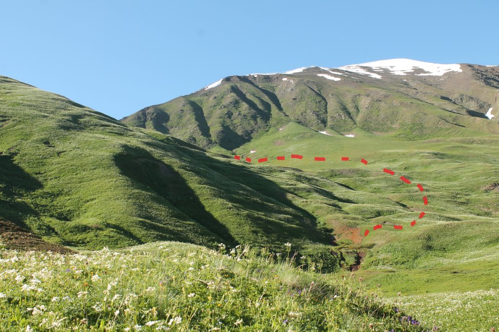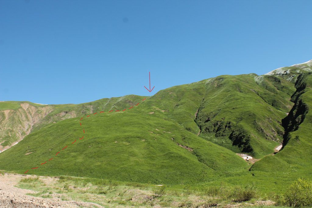 По распадку, усеянному голыми камнями в 9:40 подошли к началу подъёма на крутой, заросший травой склон. Склон очень крутой для травяного, наибольшей крутизной отличается его нижняя часть, около 40°. Ильяс как только поднимался на метров 5, так соскальзывал к началу подъёма. И так несколько раз. Пришлось бросить верёвку, чтобы участники, держась за неё, смогли подняться . Спустя 100 метров склон стал несколько положе, а затем мы вышли на русло сухого ручья, которое берёт начало на перевале и проходит западнее маршрута нашего подъёма. На пути русла есть некое подобие ступенек, возможно, подниматься по нему с самого начала было бы легче.