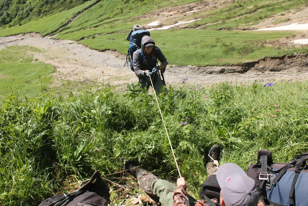 Переправа в этом месте была нашей ошибкой. Лучше было бы почти до конца движения к перевалу Каретта держаться орографически левого берега. Как потом оказалось, по левому берегу идёт тропа, а по правому было бездорожье крутых травянистых склонов, которое мы с трудом преодолевали траверсом. И переправа в верховьях реки была бы легче. Но с другой стороны переправа с натягиванием полиспаста стала для группы хорошей тренировкой.