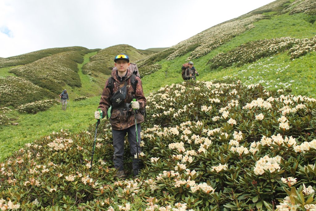 Рододендрон — мой любимый цветок. Он растёт в горах, на невысоких кустах. Заросли этих кустов с плотными тёмно-зелёными листьями порой покрывают весь склон. Цветы крупные, обильно устилают концы веток кустарника. На Кавказе обычно рододендрон белого цвета, а на спуске с перевала Вахушти-4 встречались цветы с розовым оттенком.