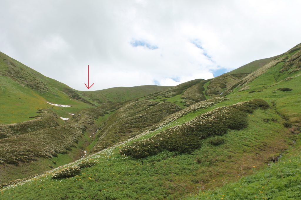 В 13:45 начали спуск на север по более пологому травяному склону. Сначала шли по малозаметной тропе, которая проводила нас через заросли цветущих рододендронов.