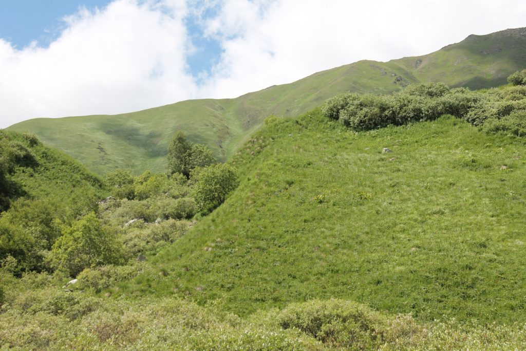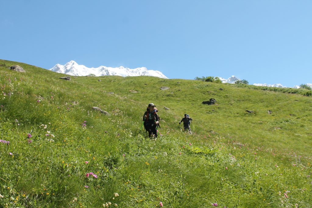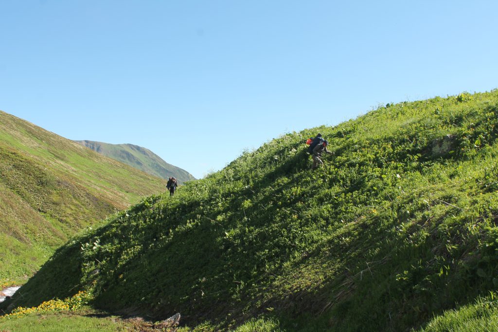 На подъёме проходили через зону альпийских лугов, представленную бурным разнотравьем. Среди высокой травы особенно выделяются жёлтые кавказские лилии и пышные голубые цветы водосбора.