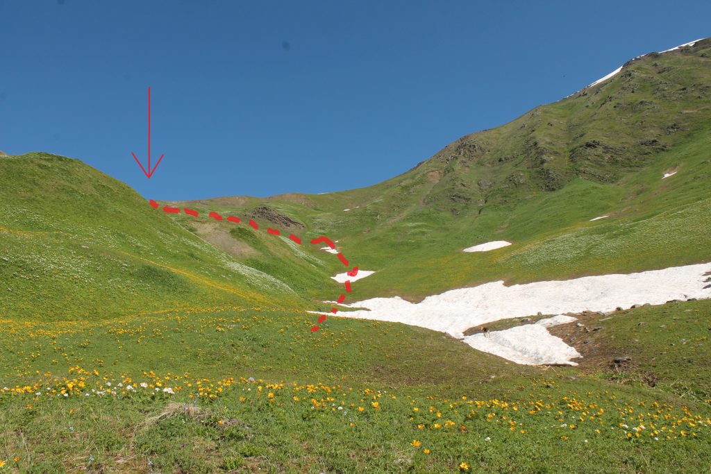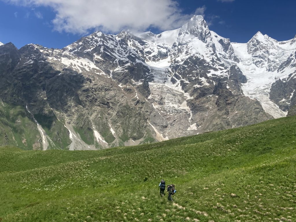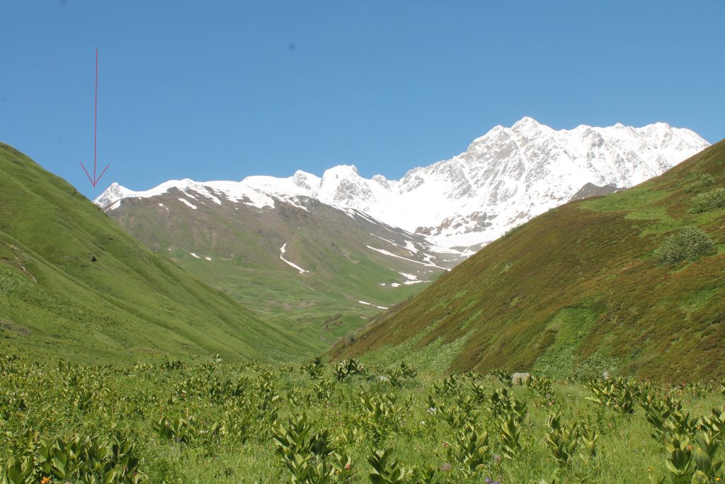 В 13:15 вышли на перевал. Седловина широкая, травяная, с небольшим снежником. Тура не обнаружили и сложили свой маленький тур, оставив в нём записку. С перевала открывается красивейший вид на Главный Кавказский хребет и вершины Шхара Западная (5069), Шхара (5193), Ушгули (4632).