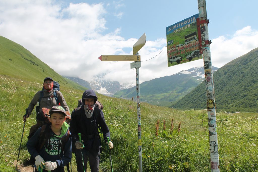 В 12:10 вошли в деревню Халде. В деревне зашли пообедать в кафе, съели хачапури и мороженое. Цены в таких горных кафе завышены в несколько раз, но туристы всё равно заходят перекусить, потому что нет конкуренции. Как говорится: «Пойди по базару, найди дешевле!» После посещения кафе продолжили путь.