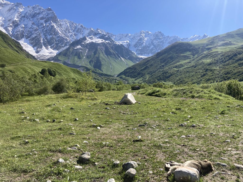 В 17:00 вышли к мосту через приток Ингури с чистой водой, затем к кафе, затем к мосту через Ингури. На правом берегу Ингури напротив кафе расположились на стоянку. Кафе в течение нашего пребывания в этом месте не работало. Ещё стоит отметить, что в данном районе много туристов на автомобилях, которые приезжают сюда из деревни Ушгули. Также много бродячих собак-попрошаек.
