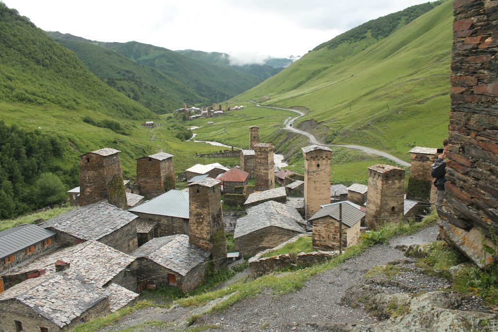 Мустафа и Ахмад остались в номере гостиницы отдыхать, а мы с Ильясом прогулялись по деревне. Здесь оставляют впечатление могучие сванские башни, возведённые несколько веков назад. Башен много. Рассказывают, что во время нападения врагов каждая семья пряталась в своей башне. В хорошую погоду из деревни видны отвесные стены вершины Шхара, но мы увидели только подножие Главного Кавказского хребта.